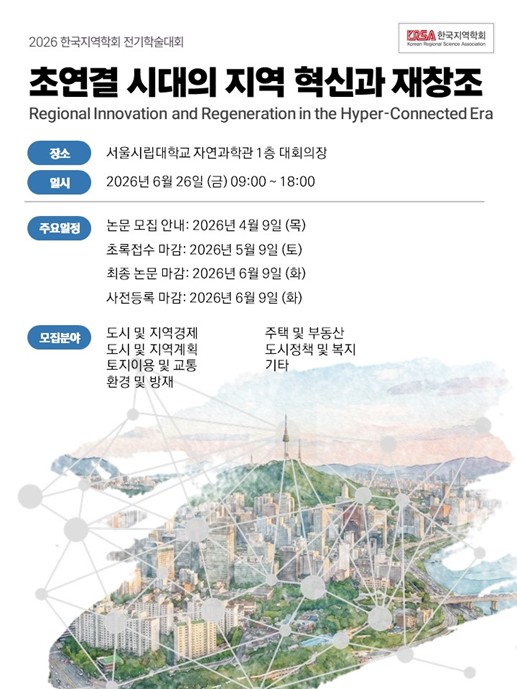 회원 여러분안녕하십니까2026 한국지역학회 전기학술대회가 서울시립대학교에서 개최될 예정입니다이번 학술대회의 주제와 일정  논문모집에 대해 아래와 같이 안내해 드립니다회원 여러분의 많은 관심과 적극적인 참여를 부탁드립니다.