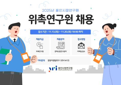 용인시정연구원에서는 용인특례시민 삶의 질 향상과 지역발전을 이끌 참신하고 유능한 직원을 아래와 같이 공개 모집중에 있습니다.